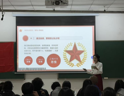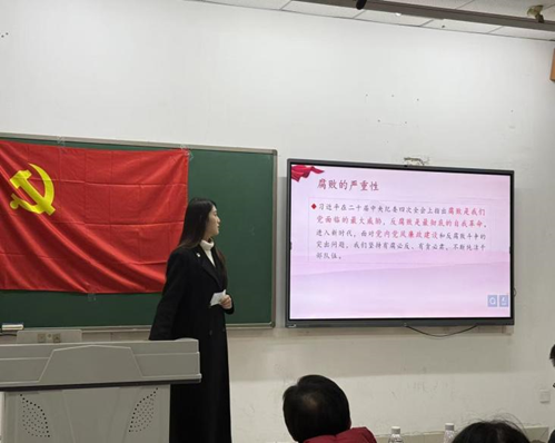 比赛现场氛围热烈,各学院选手各展所长,以多元形式诠释廉洁初心。我院两组选手表现尤为亮眼,紧扣比赛主题,结合自身成长践行习近平总书记“把实现个人价值同党和国家前途命运紧紧联系在一起”的要求,生动传递廉洁理念。选手紧扣“青年视角下的廉洁初心”,以青春化表达传递廉洁理念。结合个人案例,将“廉洁如匠心”的比喻融入党课,从“个人实践守底线”延伸至“青年成长守初心”,既有基本素养又具思想深度,用“真实案例+真情讲述”的形式,立足校园生活实际,诠释青年学子“严私德、守小节”的自觉,展现新时代青年对廉洁自律的坚定践行,引发全场热烈共鸣。