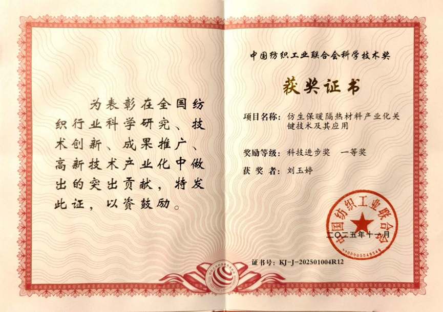 2025年11月28日,2025年度中国纺织工业联合会科学技术奖励大会在北京人民大会堂隆重举行。由四川圣山白玉兰实业有限公司研发团队参与、我院优秀毕业生刘玉婷作为完成人之一的《仿生保暖隔热材料产业化关键技术及其应用》项目,荣获科技进步奖一等奖。